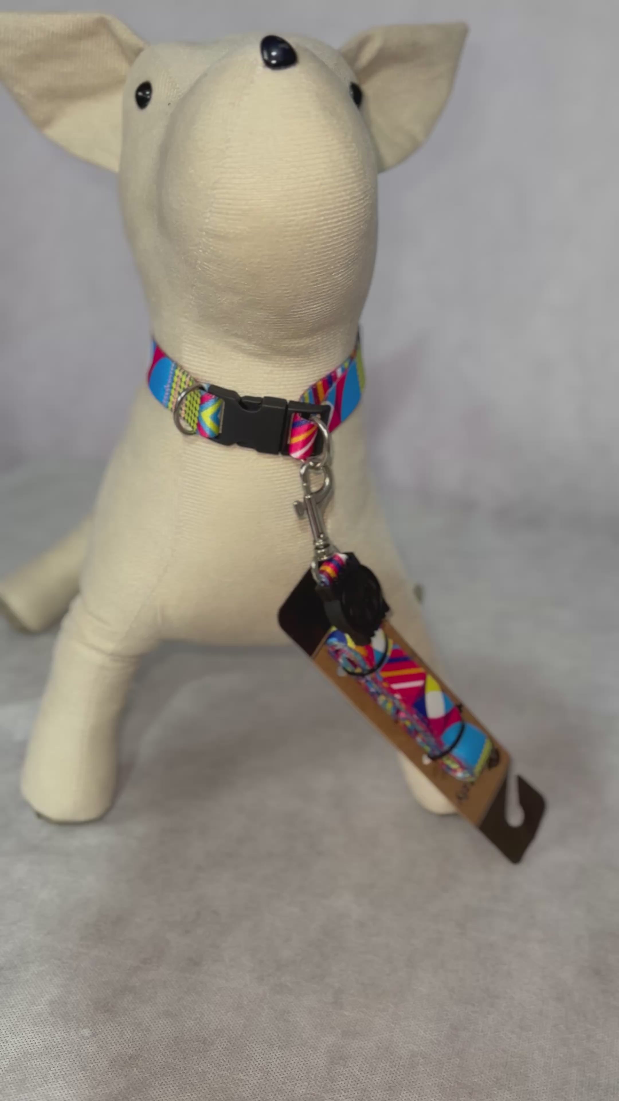 Conjunto prático e resistente para passeios seguros com seu pet. Produzido em fita de nylon de alta durabilidade, conta com coleira ajustável, fecho de engate rápido e argolas metálicas para maior segurança. A guia inclusa possui mosquetão em metal, garantindo firmeza no uso diário.